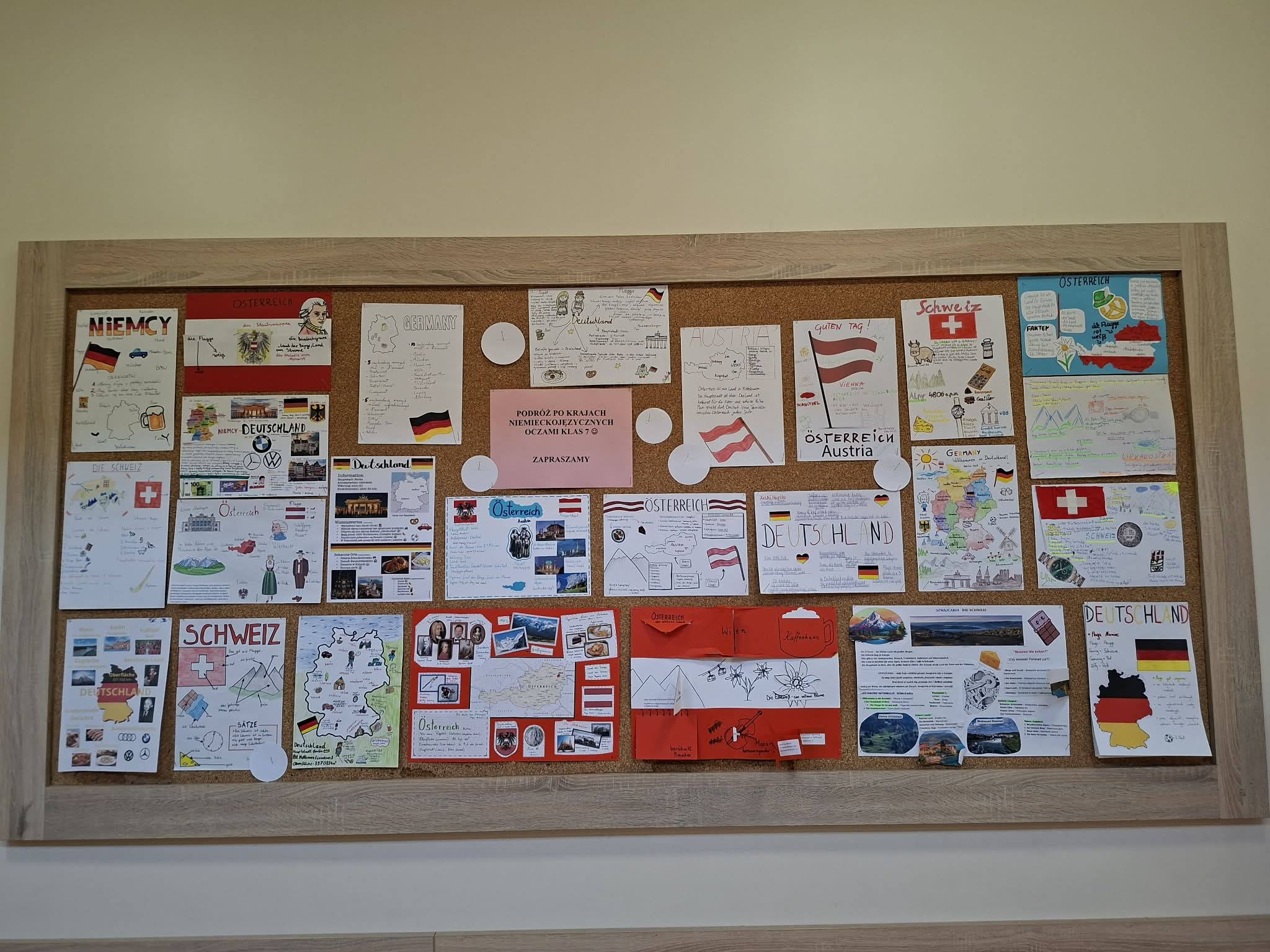 W ostatnim czasie w naszej szkole został zrealizowany projekt językowy pt. „Podróż po krajach niemieckojęzycznych”. Choć miał on charakter nieobowiązkowy, spotkał się z ogromnym zainteresowaniem uczniów wszystkich klas 7 i został wykonany niemal w 100%, co zasługuje na szczególne uznanie.