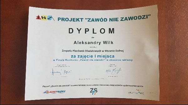 Serdeczne gratulacje dla Aleksandry Wilk uczennicy klasy VII, która zajęła I miejsce w Finale Konkursu "Zawód nie zawodzi" w obszarze reklamy.