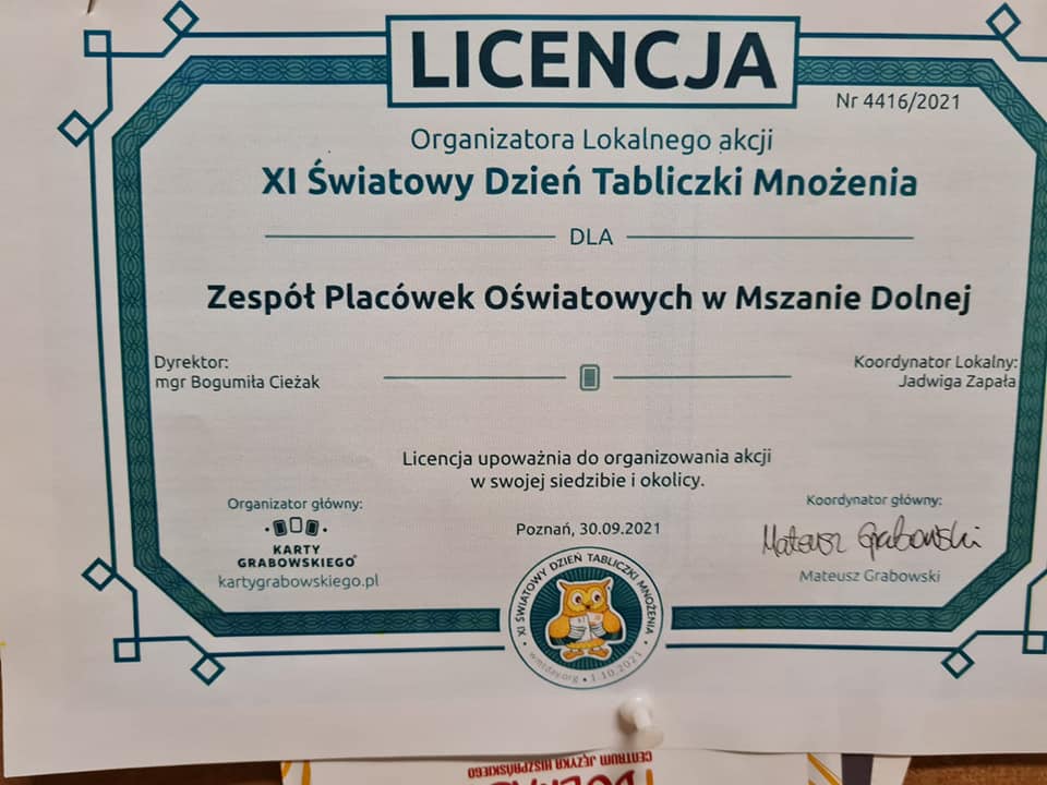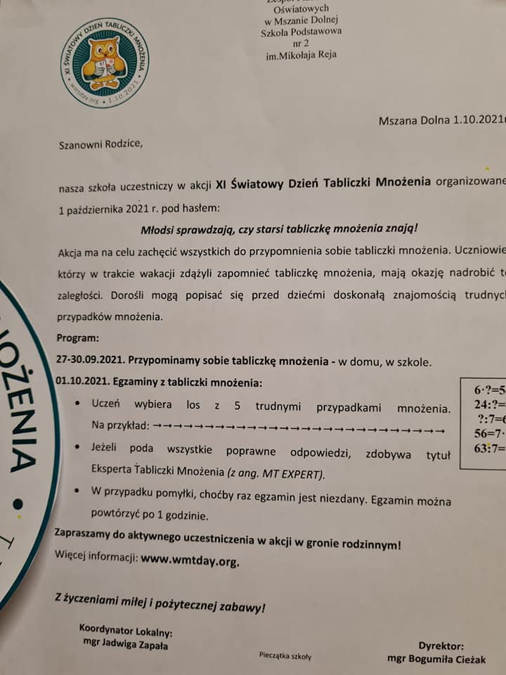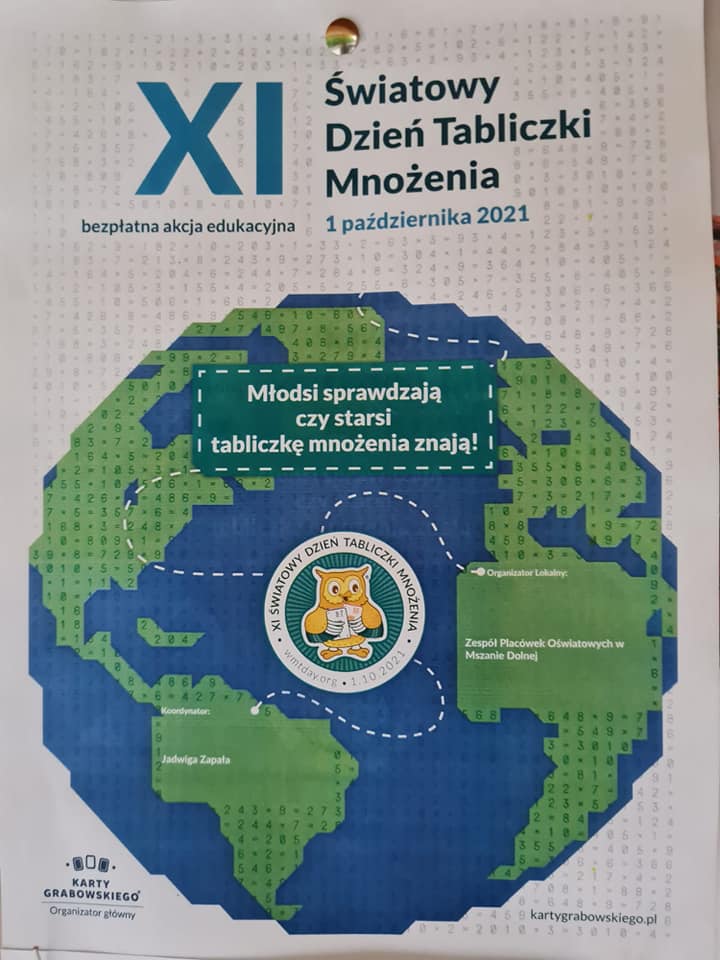 Nasza Szkoła po raz kolejny wzięła udział 1 października 2021r. tj. piątek, w akcji XI Światowy Dzień Tabliczki Mnożenia, pod hasłem: ,,Młodsi sprawdzają, czy starsi tabliczkę mnożenia znają!”. Uczniowie z klas ósmych naszej szkoły, podzieleni byli na komisje egzaminacyjne, które przeprowadzały na terenie szkoły egzamin w sposób humorystyczny, wśród klas młodszych, kl.4-8, oraz nauczycieli i pracowników szkoły.