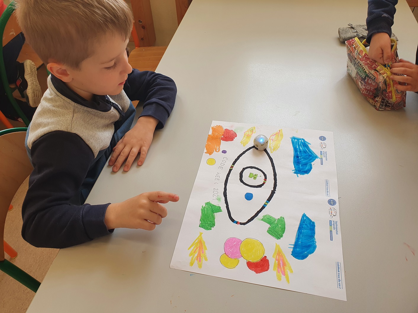 Dzieci z oddziału przedszkolnego „b” wzięły udział w EU Codeweek 2021. Europejski Tydzień Kodowania to inicjatywa promująca programowanie i umiejętności cyfrowe wśród uczestników w ciekawy i interesujący sposób. To również pozytywny wyścig krajów europejskich w liczbie dodanych wydarzeń. W erze cyfrowej nauka kodowania pomaga dzieciom w osiągnięciu wysokiego poziomu kompetencji cyfrowych i lepszym zrozumieniu otaczającego ich świata, który ulega ciągłym zmianom, a także zwiększa ich szanse na odniesienie sukcesu w życiu osobistym i zawodowym.