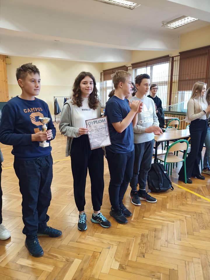 Gratulacje dla reprezentacji naszej szkoły: Kuba Surma 7a, Jan Walancik 7a, Kaja Bulik 8a, Damian Florek 8b, która zajęła III miejsce w Powiatowych Igrzyskach Młodzieży Szkolnej w Drużynowym Turnieju Szachowym.