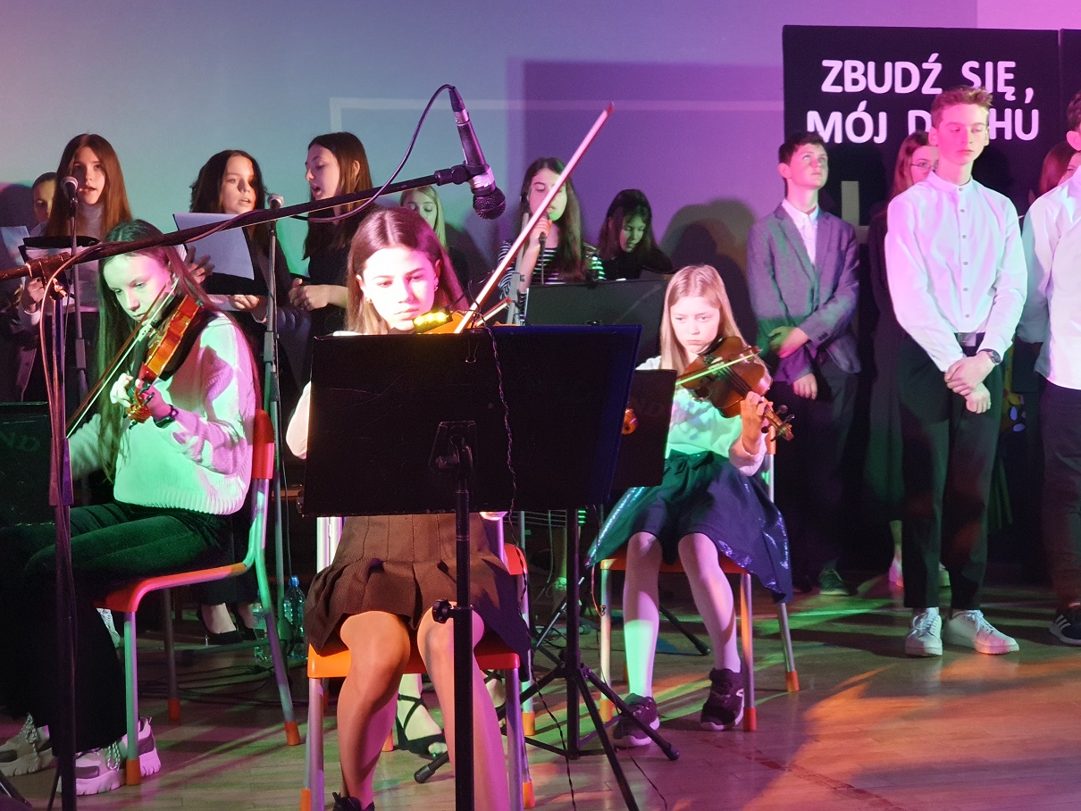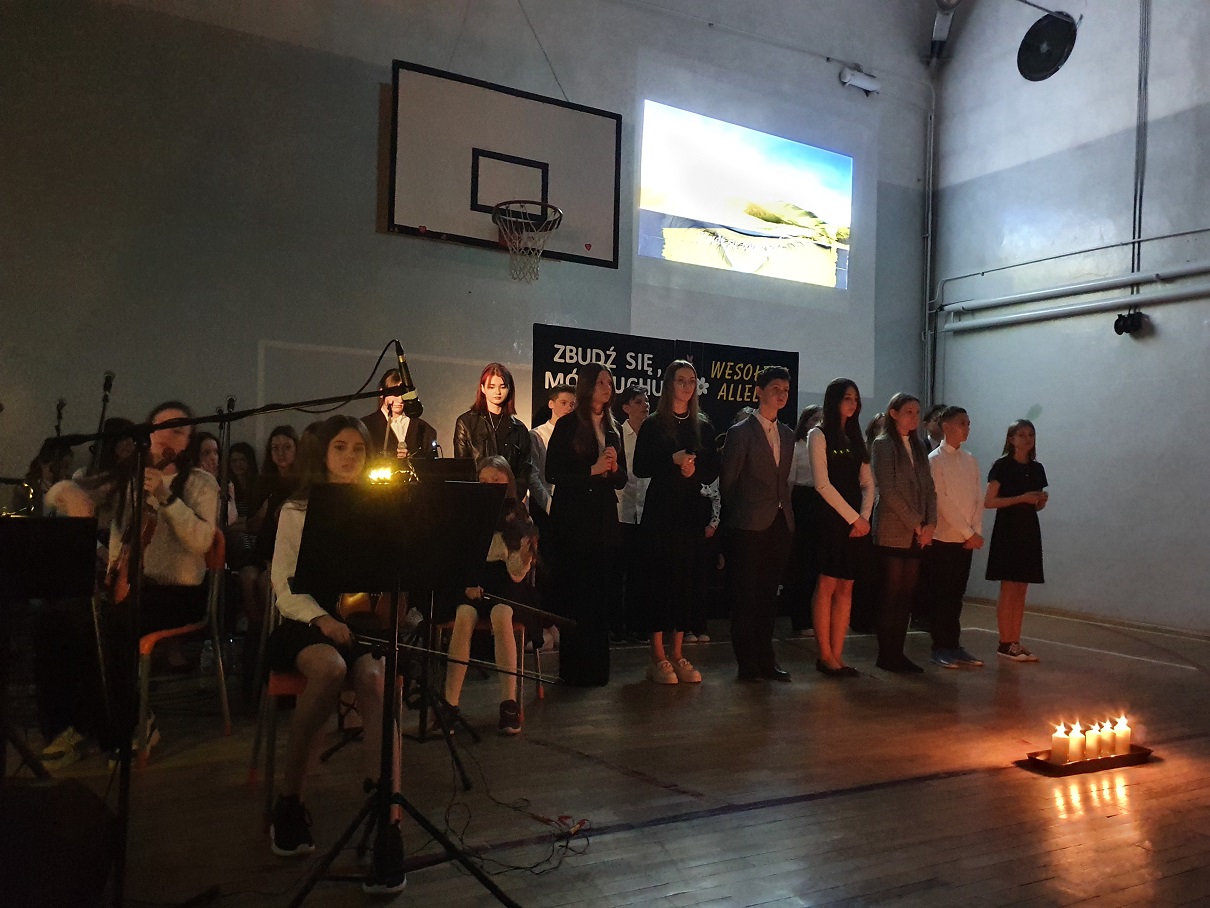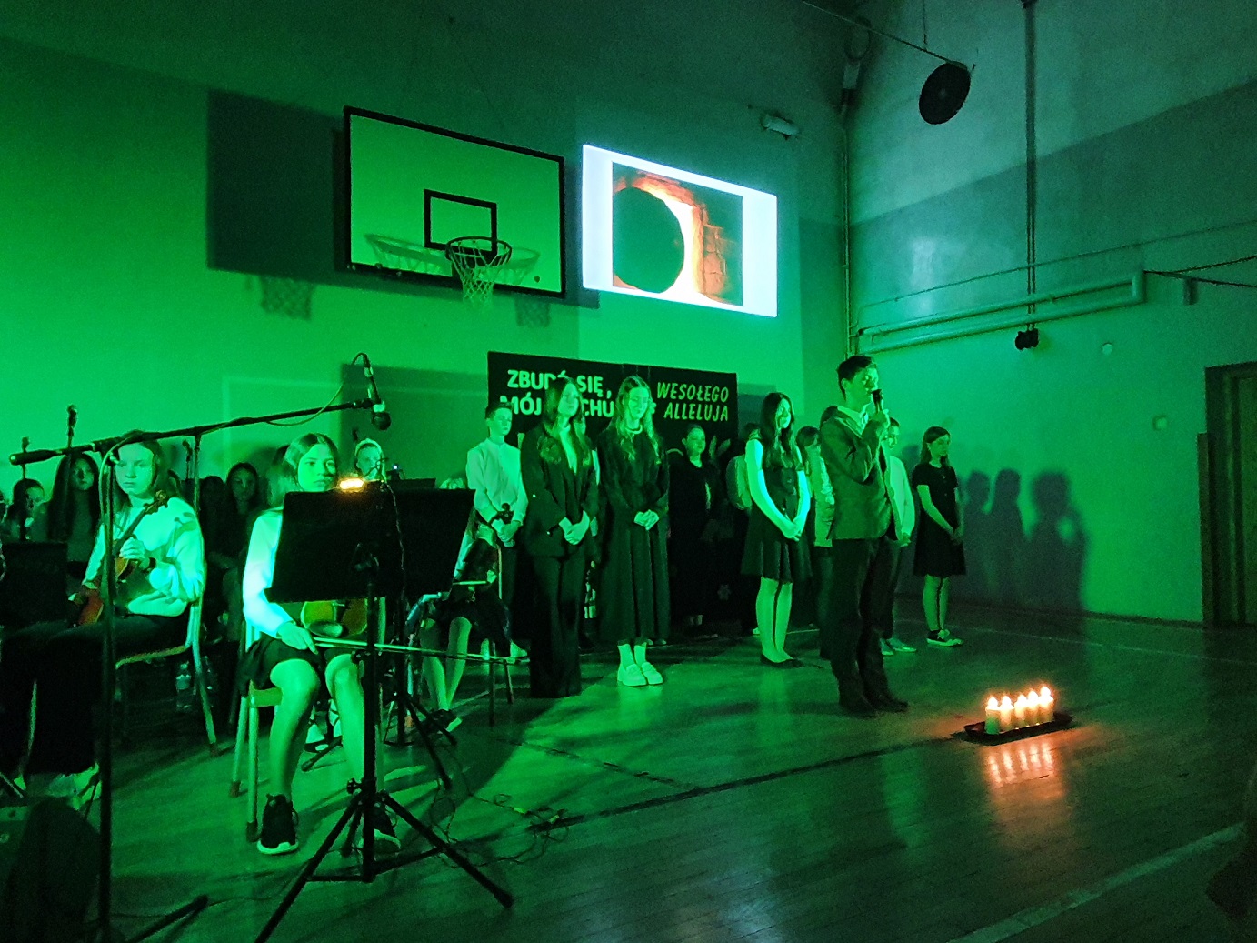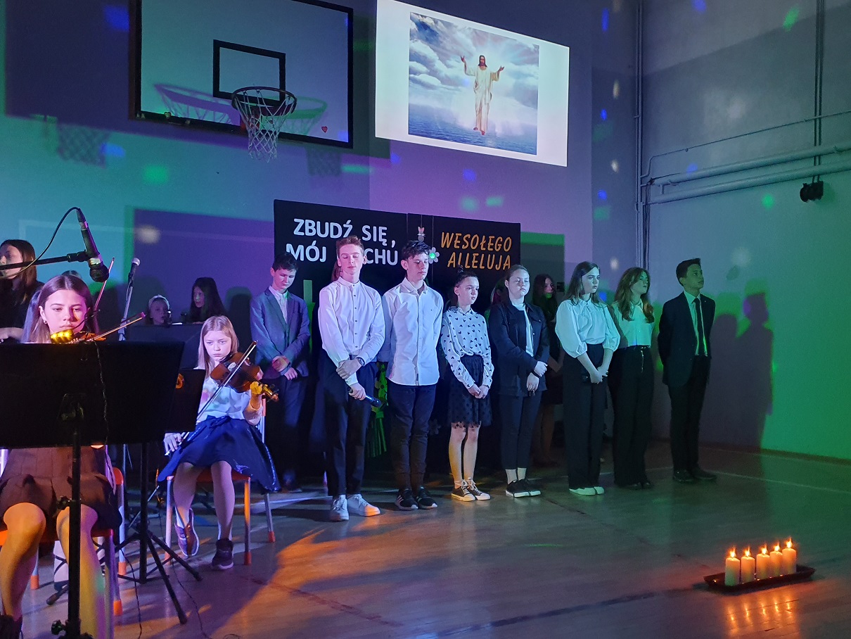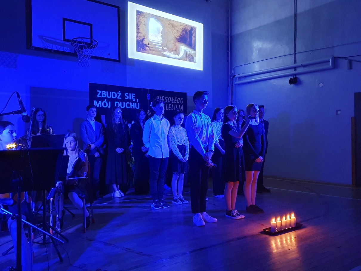 "Dziwny jest ten świat..." - słowami piosenki Czesława Niemena rozpoczęła się inscenizacja przygotowana przez uczniów naszej szkoły z okazji Świąt Wielkanocnych. W czasie, gdy każdy dzień przynosi coraz więcej krzywdy, brutalności, bólu, zakłamania... Kiedy człowiek zapomina czym jest dobro, braterstwo i przebaczenie... Gdy gubi się w tym "dziwnym świecie", porzucając wartości takie jak: prawda, szacunek i zrozumienie... Dobrze jest móc spotkać się z całą szkolną społecznością, wsłuchać w piękną recytację tekstów m.in. ks. Jana Twardowskiego i śpiew "Leśnego Bandu", przypominając sobie przy tym istotę świąt Zmartwychwstania Pańskiego. Chrystus był umarły, a na nowo powrócił do życia i obdarzył nas nadzieją. Może to właśnie ona poruszy nasze serca, które będą nieść miłość tam, gdzie panuje nienawiść, radość tam, gdzie panuje smutek i przebaczenie tam, gdzie panuje krzywda...
